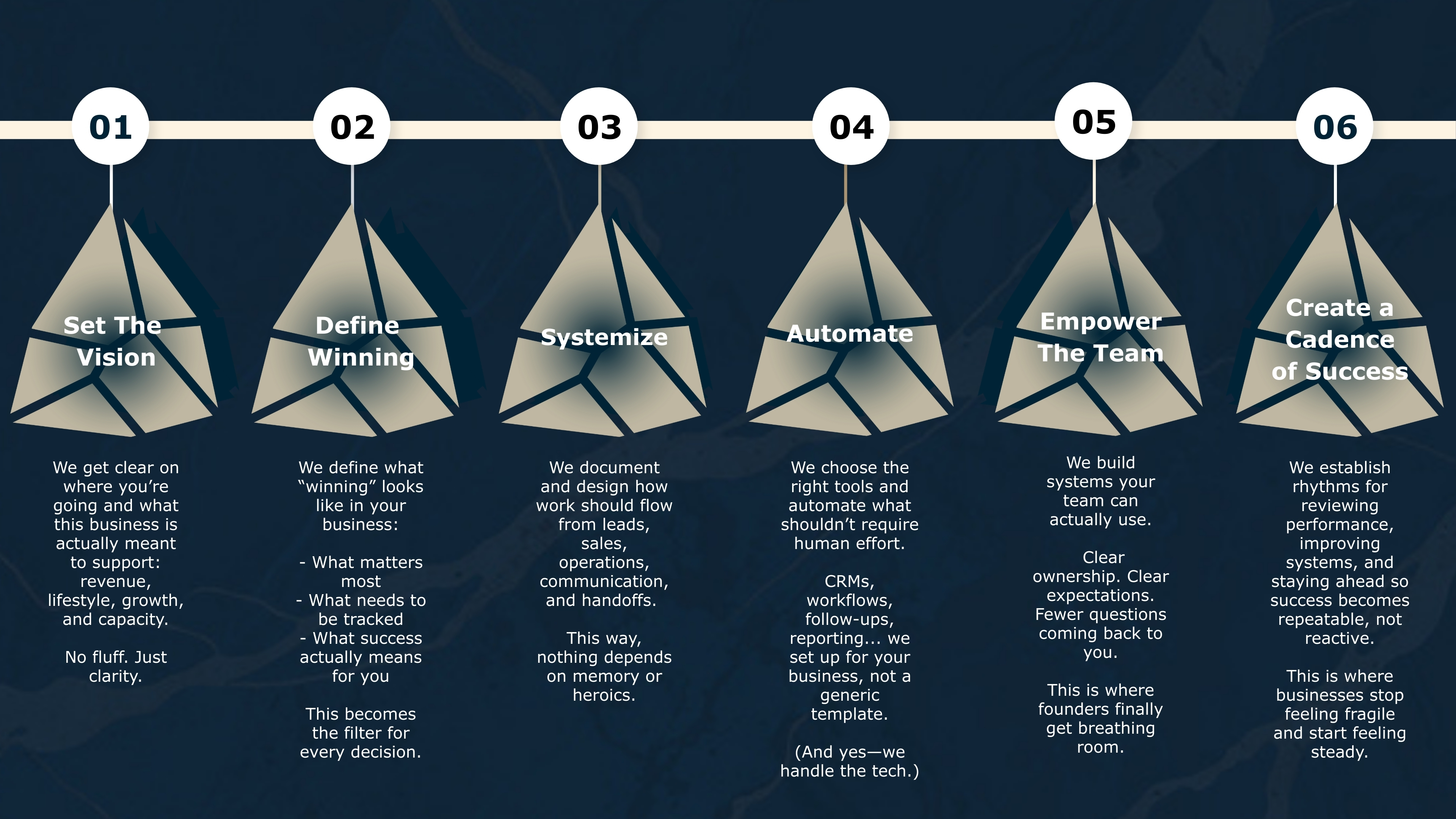 Whether you’re defining what winning looks like, automating your operations, or creating consistency at scale, our services are designed to meet you where you are and guide you forward with intention.
